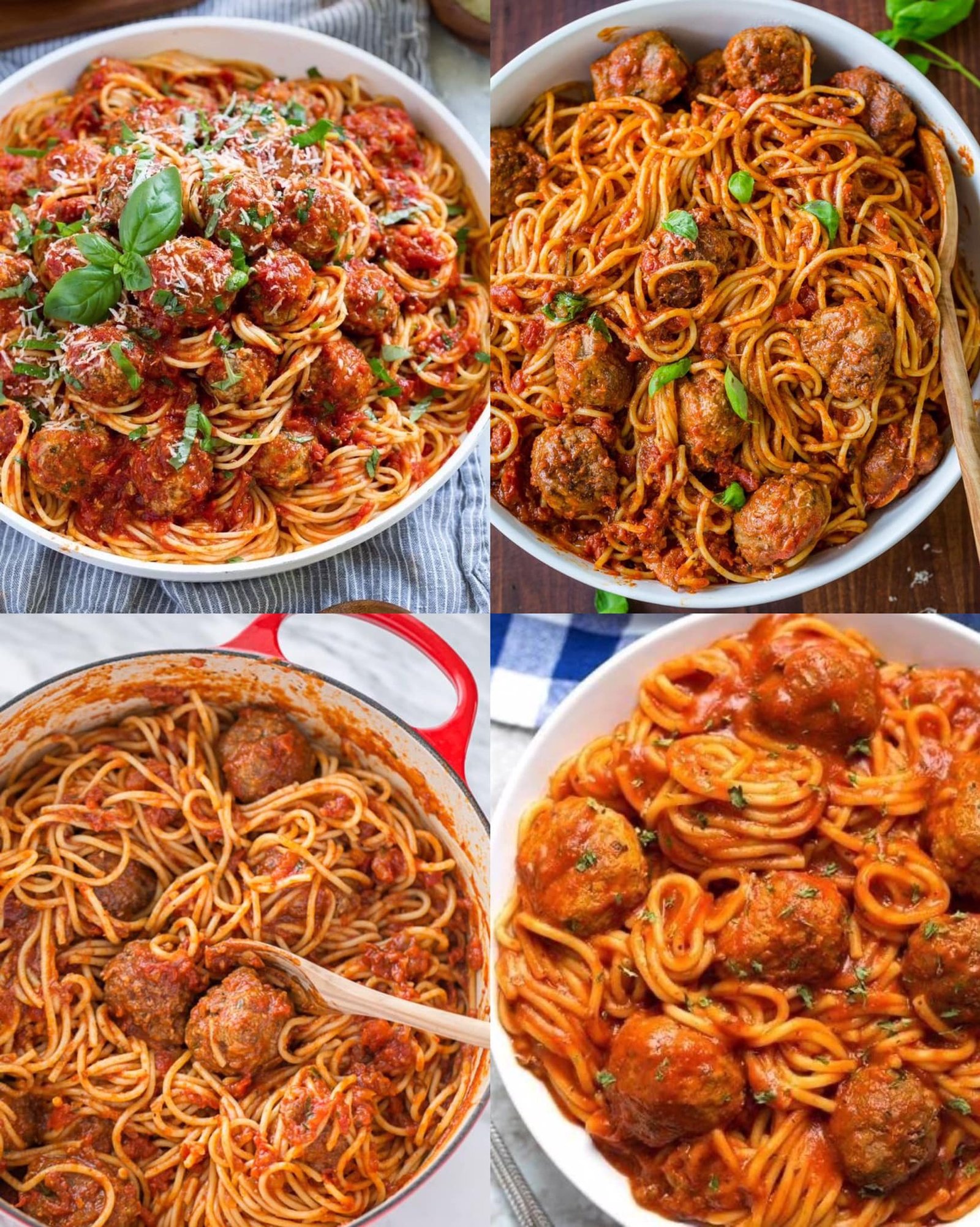 La receta básica implica la preparación de albóndigas a partir de carne picada, pan rallado, huevos y condimentos, que se forman en pequeñas bolas y se doran antes de cocinarlas en una salsa de tomate sazonada con hierbas y especias. Los espaguetis se cuecen por separado y se sirven con las albóndigas y la salsa.