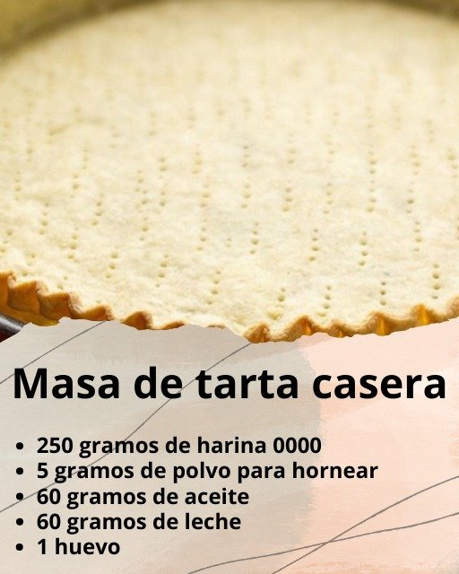 La masa de tarta es muy fácil de elaborar en casa con pocos ingredientes. Queda muy rica y es más sano. Su apariencia se asemeja a una masa brisé, se elabora con poco aceite y no se utiliza manteca. Queda suave, no se percibe materia grasa, tierna y también crocante.
